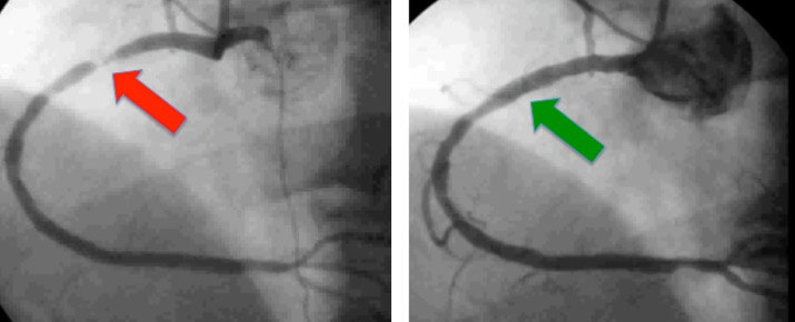 Example of coronary angiogram of a 55 year old gentleman with chest pain. Image on the left shows the right coronary artery with a severe narrowing (red arrow). Image on the right was taken after angioplasty and stenting showing resolution of the narrowing.